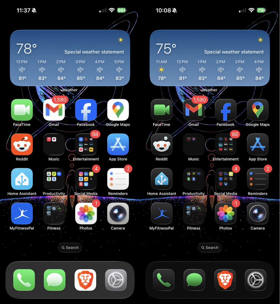 The default icons were the most distracting to me, so I switched them to the Dark Mode icons. To do this: hold down on the Home Screen → Edit → Customize → Select Icon Type (Default, Dark, Clear, or Tinted).