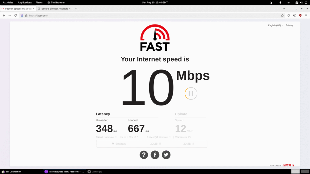 I was curious at how fast the connection would be with Tor. It was slower then normal but very usable. I wouldn’t recommend using it for steaming video though. I as able to get between 10 and 50 Mbps while testing.